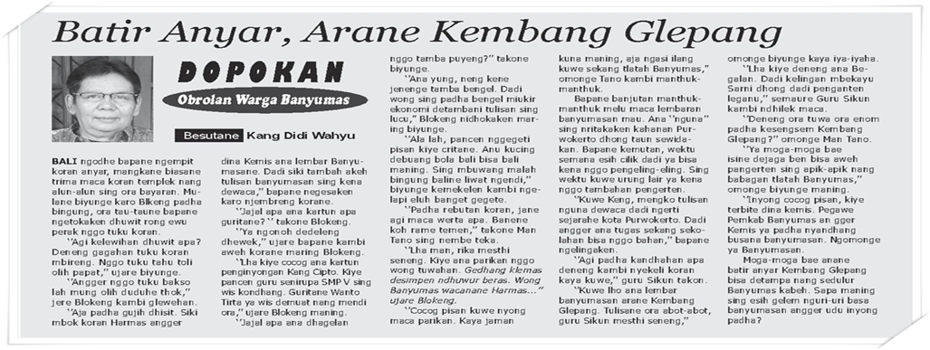 Dhalang Banyumasan basa daerahipun nggih basa Jawi teng Banyumas. Lah niki ingkang dipun kajengaken dhalang sa krune, klebet penggemareniku dados tiyang penyangga lestantunipunbasa Sastra Jawi Banyumasan. Lah angger dhalange mboten nate kangge niku tah urusan nasib. Senajan mekatena manungsa dipun wenangaken usaha. Pripun carane supadose dhalange pajeng.